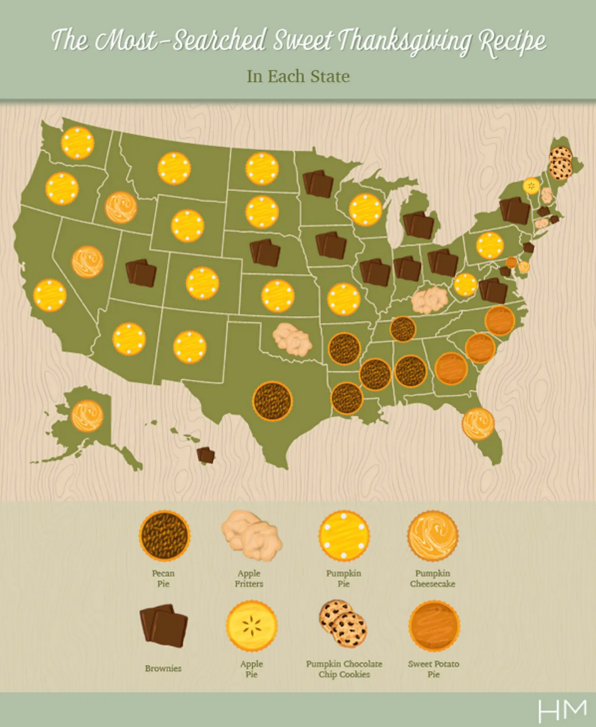 And we didn’t forget about dessert, the best part of the Thanksgiving Day meal. Whether it’s apple pie, pumpkin pie, brownies, or cheesecake, we love it all. Not a surprise, the southern states love their pecan pie and are searching for the best recipe. The delicious, traditional southern pie was the most searched for dessert in six states, including Mississippi, Alabama, and Louisiana.