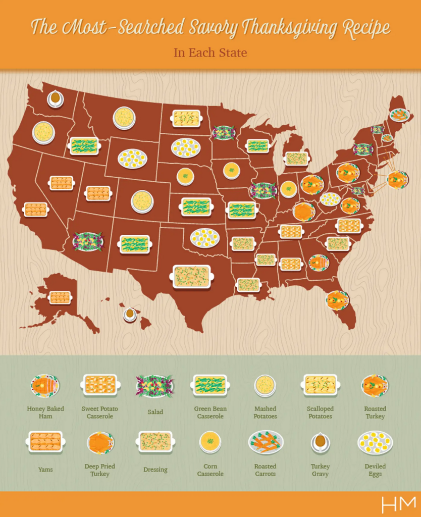 Sometimes that favorite recipe or dish varies based on where you grew up, where your family is from, or where you’re currently living. Different areas of the country and different states have Thanksgiving recipes that are traditional to those areas or staples for their Thanksgiving meals. This got us thinking, what are the most popular Thanksgiving Day recipes in every state?