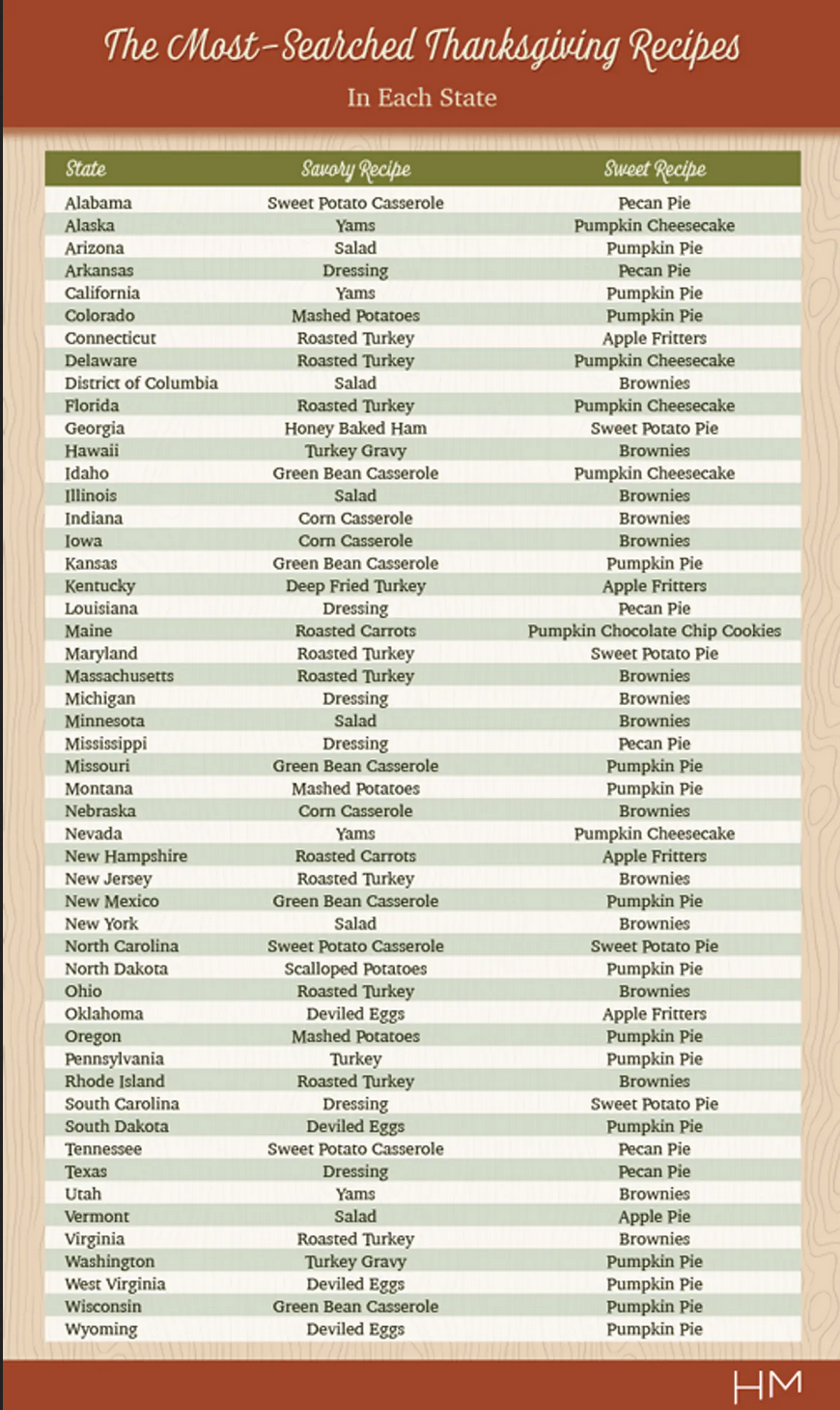 And we didn’t forget about dessert, the best part of the Thanksgiving Day meal. Whether it’s apple pie, pumpkin pie, brownies, or cheesecake, we love it all. Not a surprise, the southern states love their pecan pie and are searching for the best recipe. The delicious, traditional southern pie was the most searched for dessert in six states, including Mississippi, Alabama, and Louisiana.